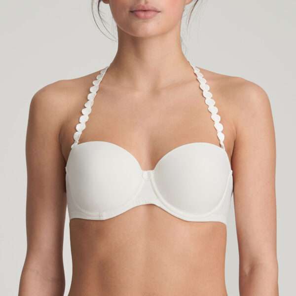 Strapless bh met de belijning van een bandeaucup. De rechte rug heeft een bredere elastische band dat in combinatie met de stof zorgt voor extra steun. Je kunt de bh strapless, om de hals of normaal dragen.